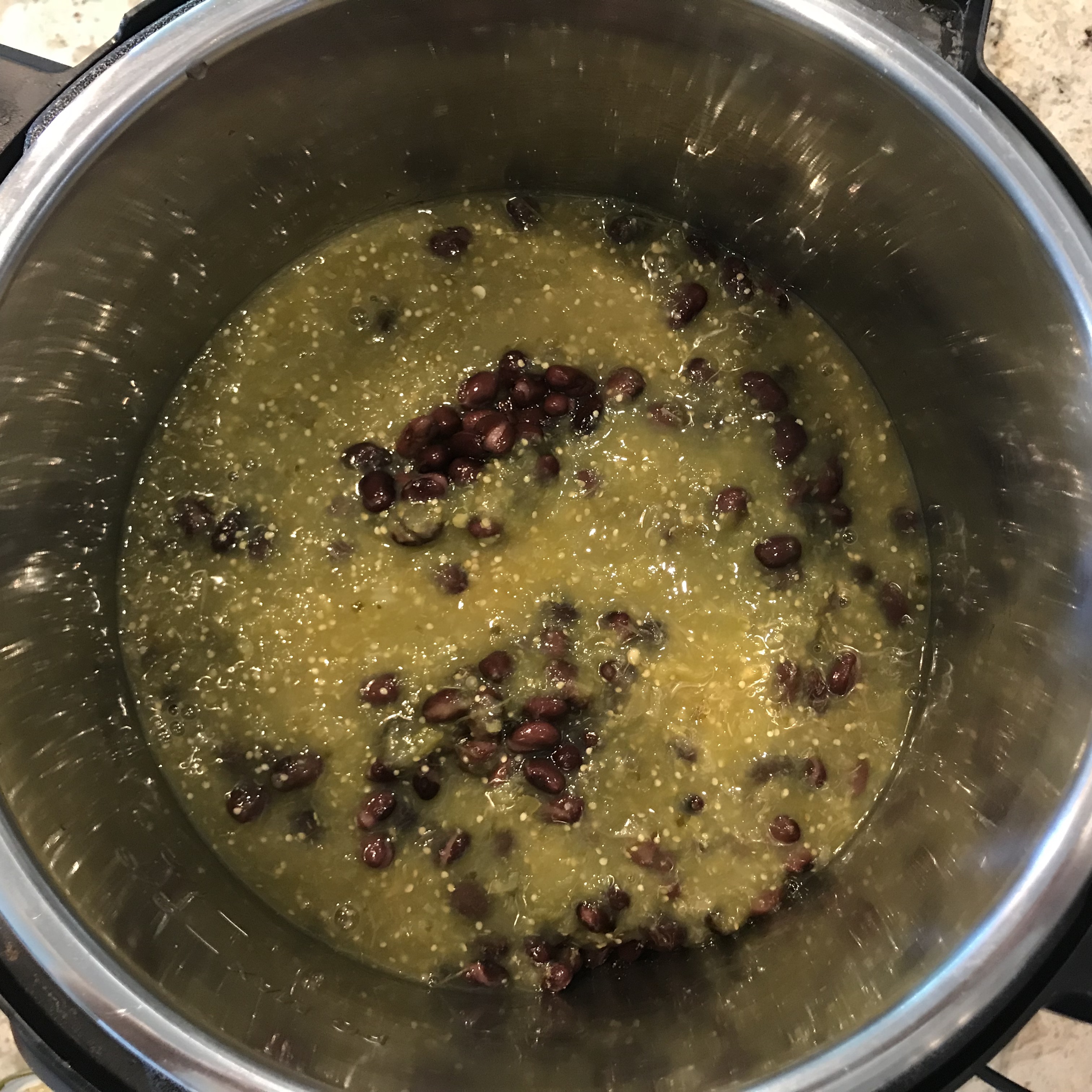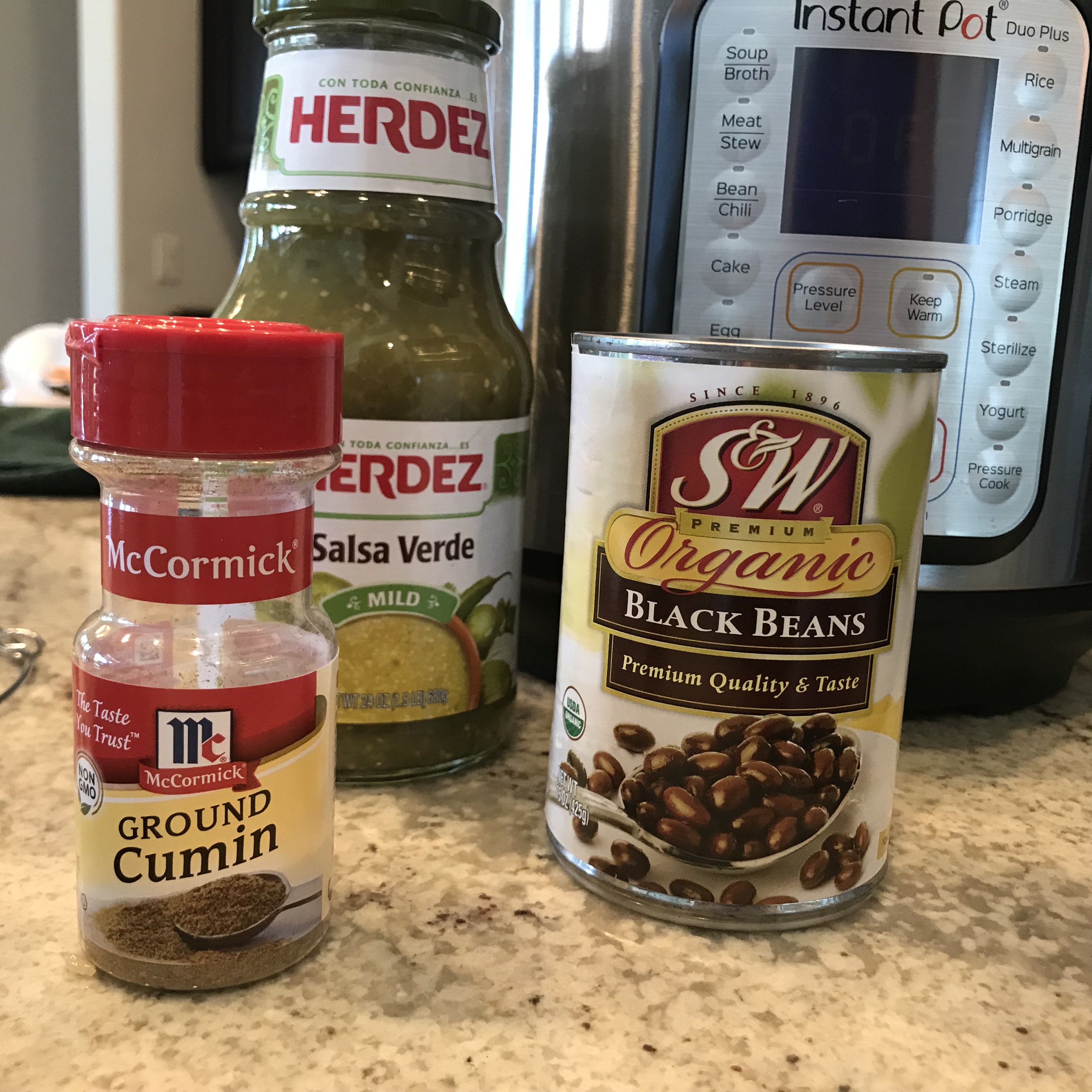Place chicken in bottom of the pot. Sprinkle cumin on top. Cover with black beans. Pour Verde sauce over everything.