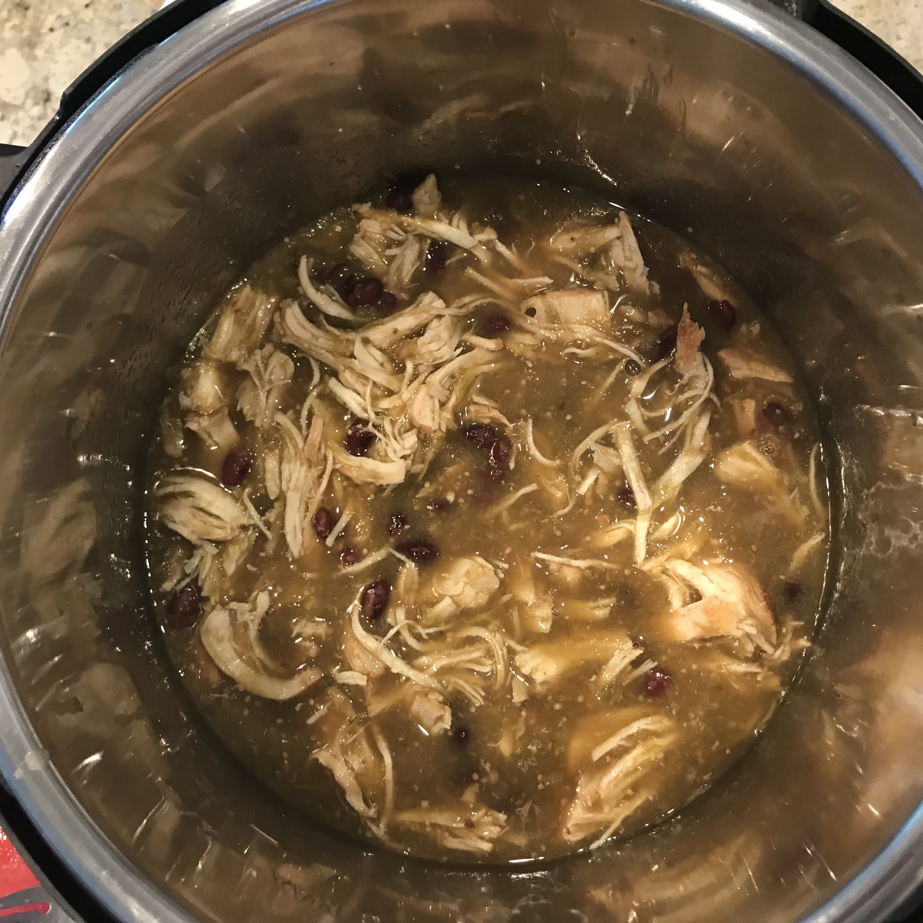 Remove chicken after cooking. Shred and mix back in with the sauce.